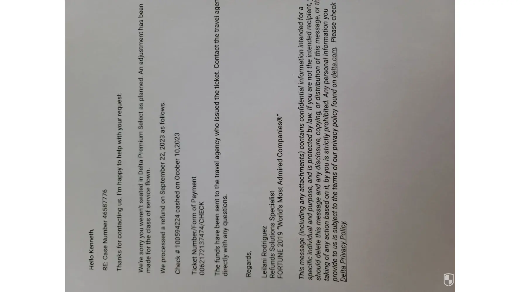 We book our vacation with Vacation by Marriott, itinerary #72570484992248. We did not get seated in Delta Premium Select as planned. Delta process a refund on September 22, 2023 for $1500 and some change and mailed to Marriott. Check#[protected] and Ticket Number/Form of Payment [protected]/check was cashed on October 10, 2023, by Marriott. My travel agent has contacted Marriott on 3 different occasions to request the refund be applied to my account and still has not been done. It should not take over a month to credit my account.