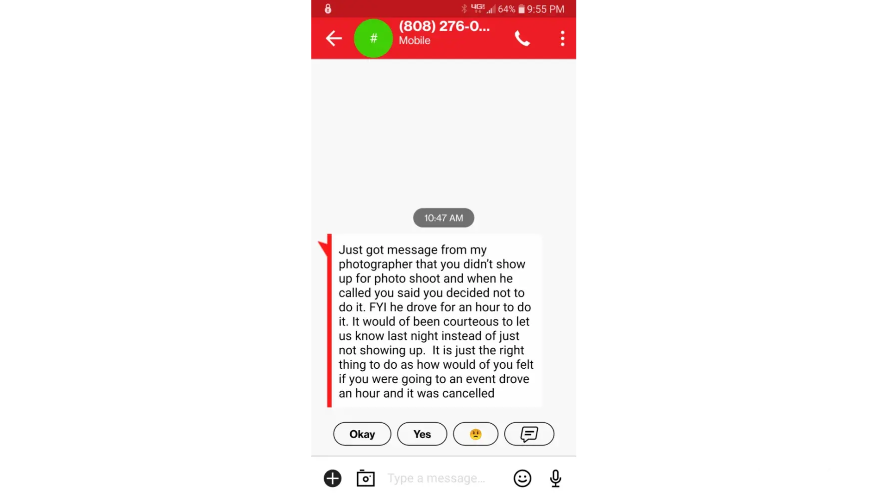 My husband and I arrived in Maui Hawaii Monday night 4/4/22. We checked in to the Marriott Maui Ocean club. Prior to arrival, I contacted the photographer who is contracted by the resort to set up an appointment to take some photos of me and my husband for our 10 yr wedding anniversary. We arranged for the shoot on Tuesday morning 4/5/22 at 9 am. Once we arrived in Maui after a long flight we decided to not participate in the photo shoot. I diid not notify the front desk of this decision when we checked in. Tuesday morning 4/5/22 the photographer reached out to me and I explained to him that my husband and I decided not to participate in the shoot. I apologized for my actions in not notifying him in advanced. I am willing to own up to my mistake. I cost him time and money. Not long after our conversation, I received a text message to my pgone from a Marriott employee. This employee did not identify themselves. The employee begins to chastise me in the text message about not showing up for my photo shoot with HIS photographer. Like the photographer is a piece of property. This incident was escalated way more than it should have. I had already spoken to and apologized to the photographer. To get berated by text message on my personal phone while on vacation by an employee who wishes to hide behind their phone and send text messages is unacceptable. I reported the incident to Guest Services. I was told that I would have gotten a call by a manager by the end of the day on Tuesday 4/5/22, but I never got a call. I chose not to answer the text message from the employee because I think that was a petty and coward move by the employee. I dont respond to pettiness. I report it.