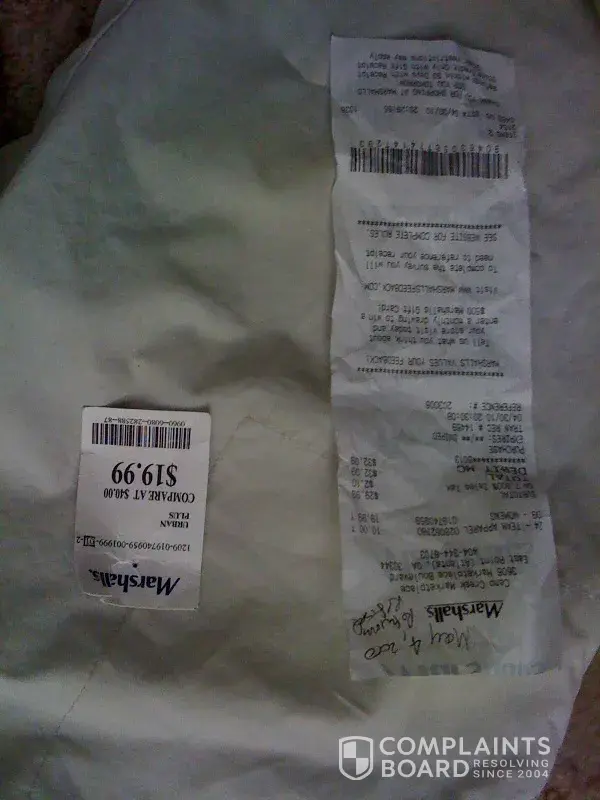 Last friday night I purchased two items at the marshalls at camp creek marketplace, 3606 marketplace blvd. Atlanta, ga 30344. One was a pair of men’s athletic shorts with georgia on the side for $10.00 and the other was a pair of khaki colored women’s size 14 pants for $19.99. The women’s pants were size 14 so I had no reason to believe they wouldn’t fix. I tore the tag off at home and put them on to wear them shopping. Well, they didn’t fix, so I put the tag in the pants pocket, put the item back in the bag with the receipt to return them.