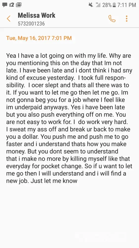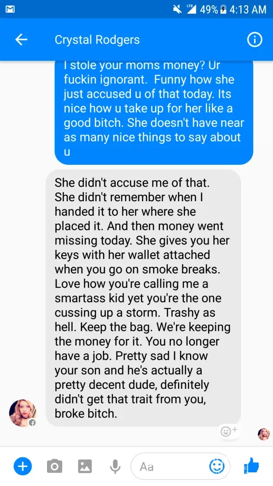 I attended a "free facial" party with Melissa Simms and Crystal Rodgers. I purchased 2 travel bags. Melissa was also my boss at the time. Crystal is Melissa daughter. I was told during this party that i could make whatever pay arrangement i felt i could afford. I agreed to do $50 a month. Melissa decides to take it upon herself to take $50 to $70 wach wwek from my check until the first one was paid off. Even after me stating several times tgat this was way over my budget considering the fact that i had now become homeless. I without a choice paid the first bag off within a month. The second bag we had agreed would come off my child support card on the 5th of each month . I didn't receive child support for the month of may and melissa and i were having issuesof our own. Mainly over me being late for work. I decided to go ahead and tell her i no longer wanted ro work for her. So atthis point Melissa decides to confiscate my whole check for payment. She also had her daughter messaging me letting me know hiw worthless i am and then accused me of stealing from her. Even after the accusations she still wanted me to work for her. This is not right. I can't take care of my children this week because she decided to take all of my money and pay way more than what we agreed