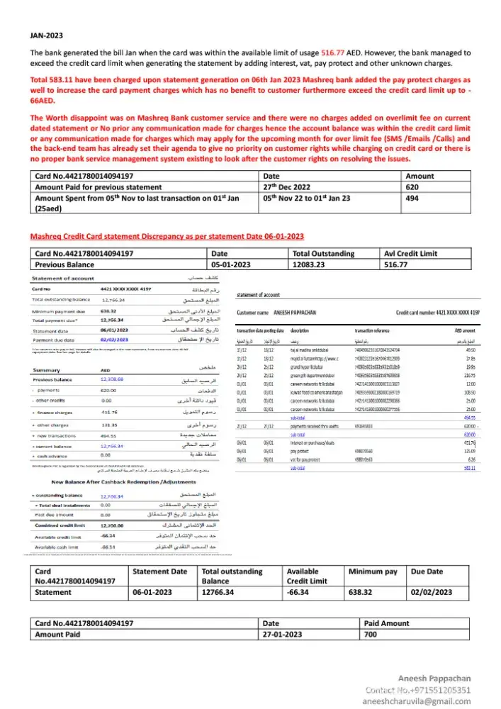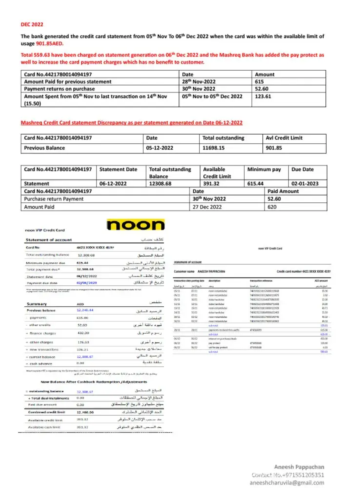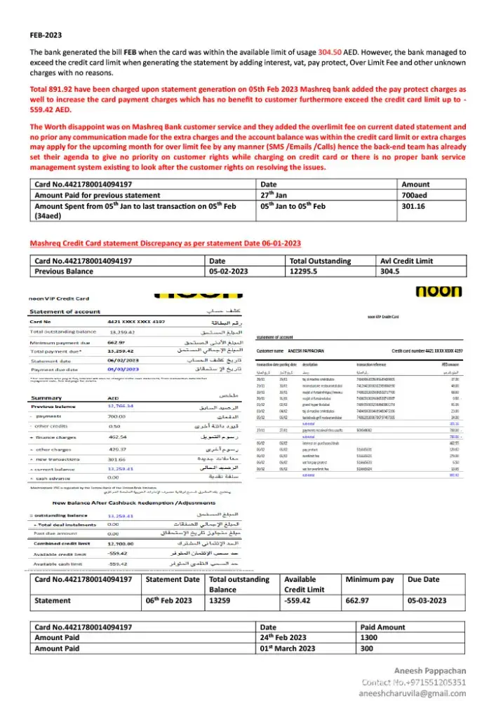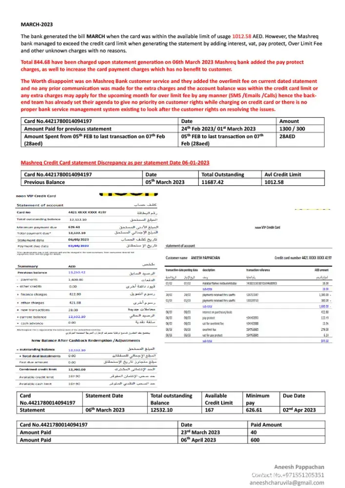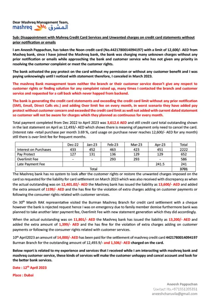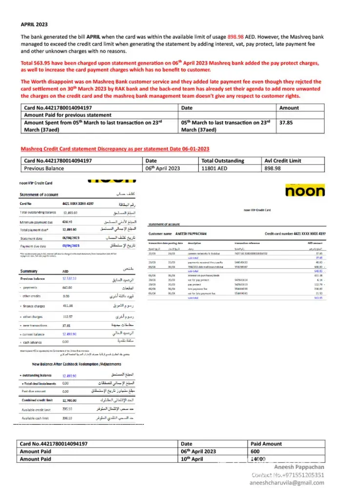 I am Aneesh Pappachan, has taken the Noon credit card (No.[protected]) with a limit of 12,600/- AED from Masheq bank, since I have joined the Mashreq bank, the bank was charging many unknown charges without any prior notification or emails while approaching the bank and customer service who has not given any priority in resolving the customer complaint or meet the customer rights.