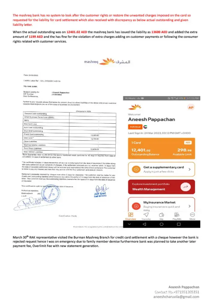 The Mashreq bank has no system to look after the customer rights or restore the unwanted charges imposed on the card so requested for the liability for card settlement on March 2023 which was also received with discrepancy as when the actual outstanding was on 12,401.02/- AED the Mashreq bank has issued the liability as 13,600/- AED and added the extra amount of 1199/- AED and the has fine for the violation of extra charges adding on customer payments or following the consumer rights related with customer services.