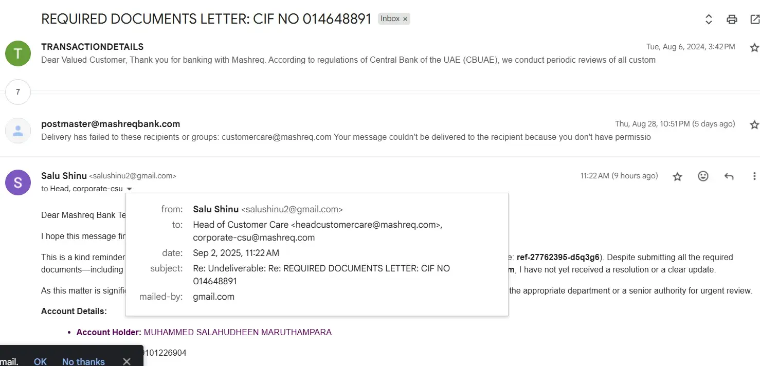 Dear Sir/Madam, I am writing to formally raise a complaint regarding the ongoing and unresolved freeze on my Mashreq Bank account, which has persisted despite my repeated attempts to resolve the issue over several weeks. Despite sending multiple emails, reminders, and the requested documents (including both my old and new Emirates IDs, and a busine...