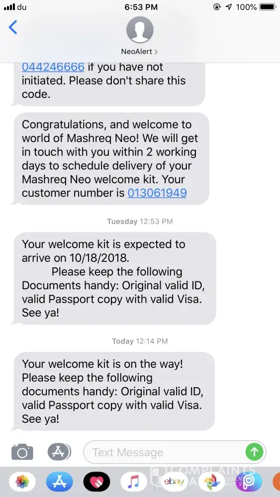 As committed by your team, I had to receive the welcome kit of Mashreq Neo. I waited till 6.00 PM today only to receivem the kit. I have given up all the other commitments for this. I received sms by afternoon ‘ your welcome kit is on the way' but after that i didn't receive any call from your team.