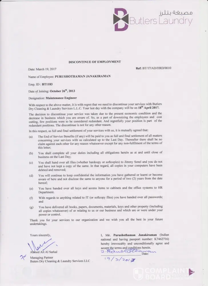 At least Butlers have to inform that my settlement will deposit with Mashreq soon or no balance to pay like end of service for Purushothaman.
