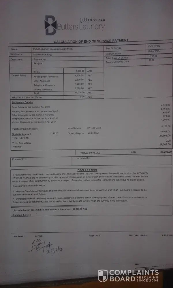 My end of service benefit is not coming from M/s Butlers laundry until now since 1.8 years. It is around Dhs32905. I am chasing for the past 1 year 8month.