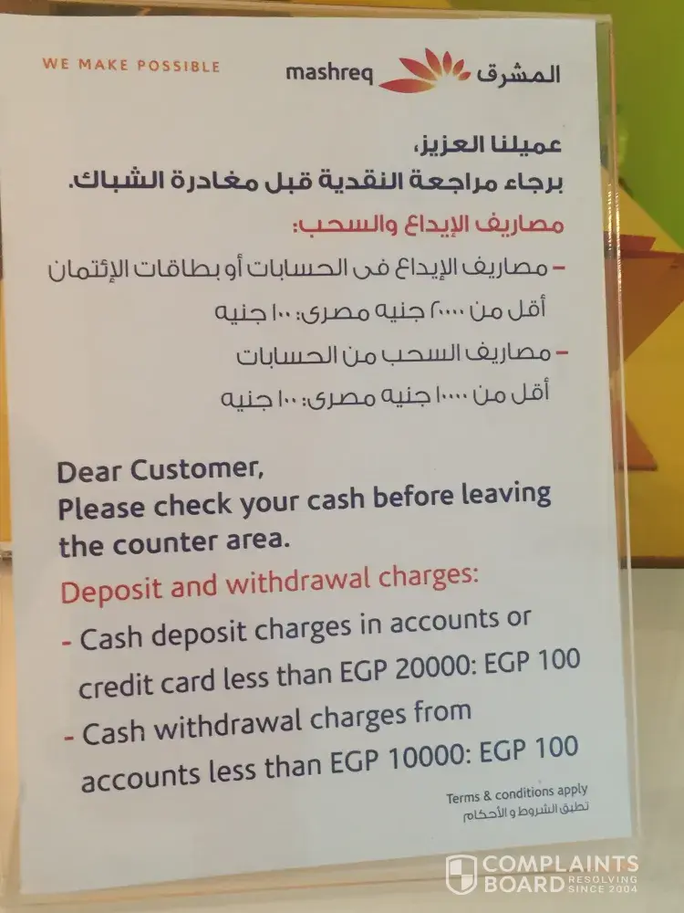 في جميع فروع بنك المشرق في مصر !مصاريف للسحب والايداع لا حول ولا قوة الا بالله. كيف !؟ اززاي يعني !؟؟ انظر الصورة المرفقة !. أي حد عايز يعمل أي حاجه. لا مشكلة. العميل والمستخدم النهائي والزبون هم آخر اهتمامات بائع السلعة او موفر الخدمة. بعكس كل دول العالم. ولا يوجد رقابة من أي نوع. أي حاجة تقدر تنهشها او تنهبها من المواطن. فلتفعل وتتوكل عل الله لأن مفيش حد هيقربلك او يكلمك. ابتسم انت في مصر. 😎👎❌