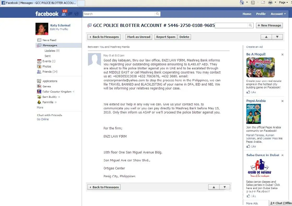 even my husband is victim, they not open or activate the credit card in mahreq and the visa, and now sent my husband a letter from legal office enzi corporation and have a loan 15.727.89 dirams, but this credit card not activate and not open, why this is have a loan to my husband, is unbelieve able, , then the recovery department ettle and aprove 4500 diram so my relatives in dubai paid this, even theres no loan there of my husband, then when ask the clearance said there another in master 36thou dirams, i almost die my blood pressure 190 over100, , , because the true is, my husband work in arabian mix and someone offer a loan in mashreq, so his credit limit is 4500 dirams, and when check his a.t.mprovide the company of my husband already there the money and wwithdraw them in that atm, then after a month recieved a 2credit card from mashreq and because the money already there in atm provide of his company ., he not open or activate the two card, in short not rub or open, and now the things that i dont understand why have a easy loan in visa both credit card?the credit limikt of my husband is only 4500 dirams, , he is not full paid yet, why theres another in master is unbelieve able, , the 4500 loan my husband paid a 9months, 286dirams in his salary cut already in his salary when he get is salary in atm, and now the name russel said there another in visa easy loan? why theres a easy loan, he not open and activate, how it happen?theres a karma, and all of us are die, so i wish and pray that those people make this scam, have a sick like cancer, , , , , ,