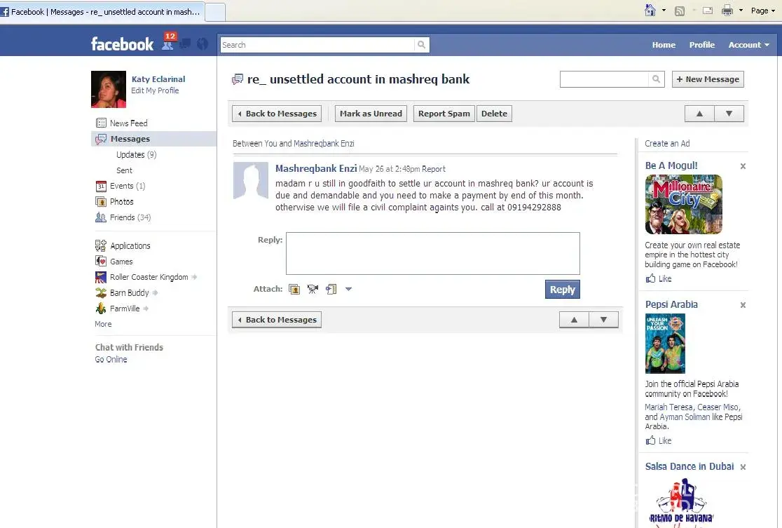 I came to know all about this in the last week of December, 2009. I was on a company assignment in Ghana when I received a call from Mr.Munjar Khan from the fraud and investigations department of Mashreq Bank. I was asked to check my account balance as I had remitted close to US$32, 000 to that account. Thinking of it as a security measure and at that time feeling good about the service that Mashreq bank provides, I logged in to www.mashreqbank.com to check my balance. To my horror, I was not able to access my account with my Internet browser informing me that my account is blocked.