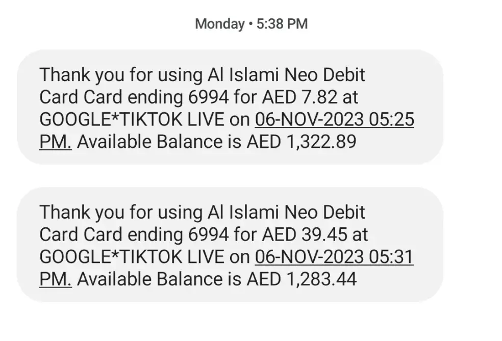 At the date 06 November 2023 some one use my card by google payment of 7.82AED and 39.45 AED
