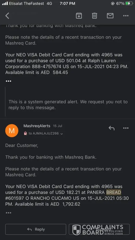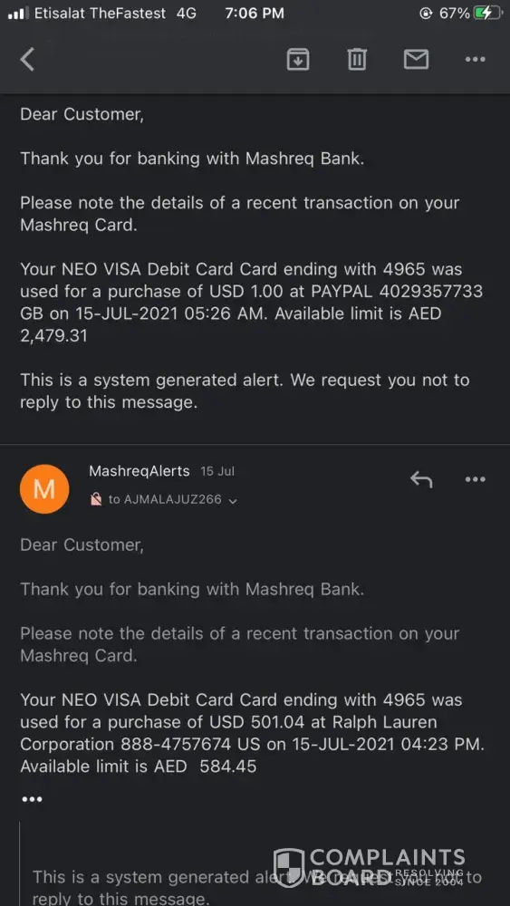 In15th july I received a message from mashreq which is - (congratulations, your card ending with 4965 has been activated for mobile wallet transaction.) but I didn't apply for any kinde of mobile wallet and after that in evening I receive my another message from mashreq amount was debited for USD 501.04 & 182.21