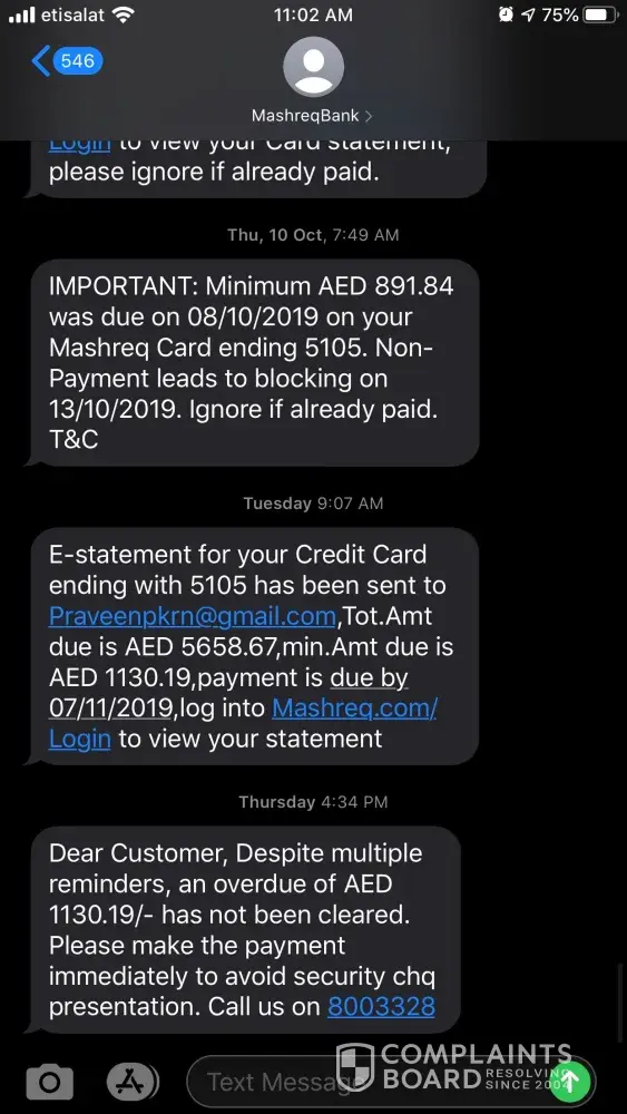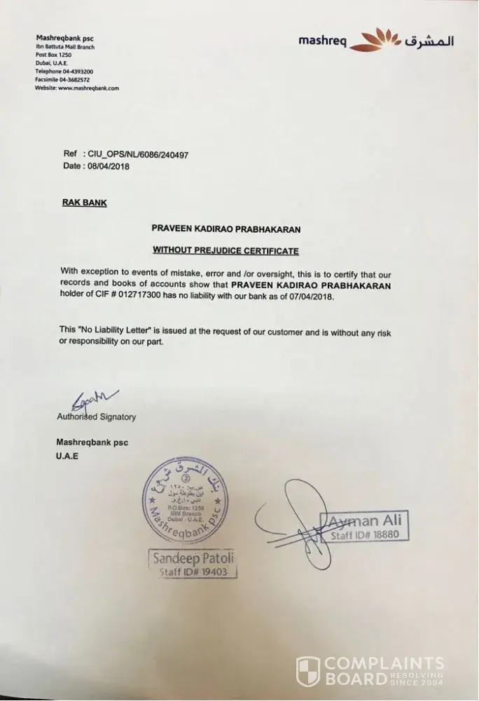 Mashreq bank has already provided me the non-liability certificate in April which you can find in the attachment. i have given this details to the legal department of Mashreq and is being following up from that date but still there is no solution and i am getting statements with fines increased every month.