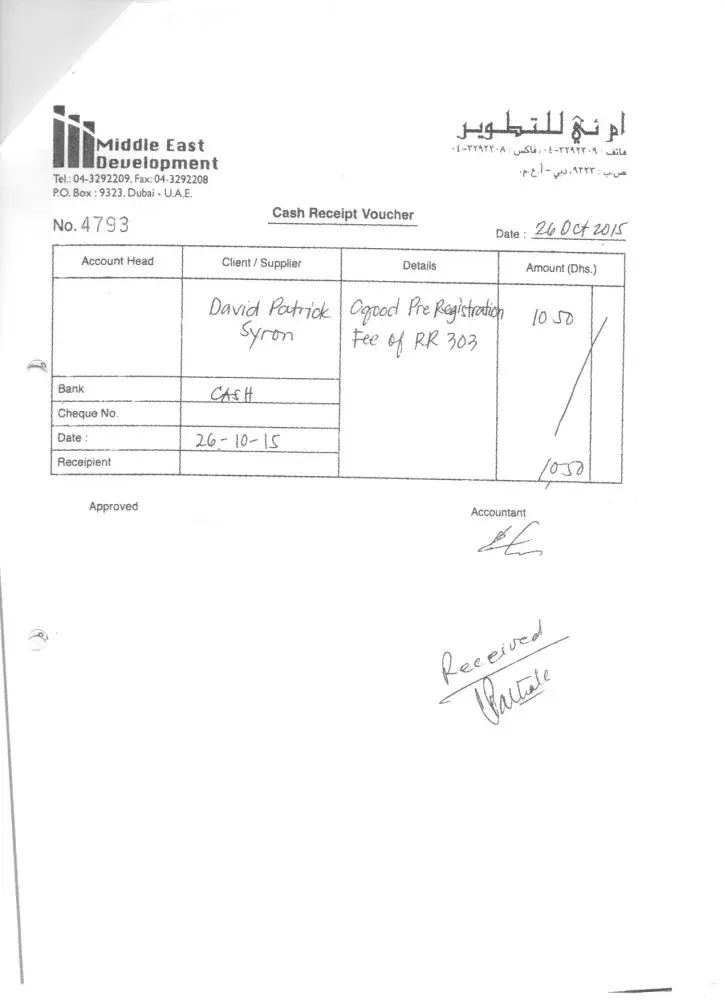 We paid cash for a Bankers Draft to Mashreq Bank of 15, 613.00 AED on the 25/10/2015