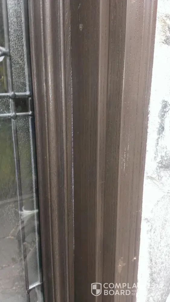 I bought a Masonite fiberglass door that was custom due to the rough opening. As other household priorities took place over the door install, the door was left in the original strapping/packing and stored vertically in a dry place for a little over two years. It never occurred to me that the door would be defective as I have 4 other Masonite doors installed...
