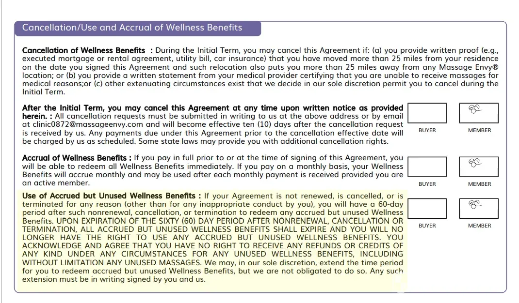 I requested to cancel my membership due to the fact that I could no longer financially support it. I reached out to the staff at my local Massage Envy and was ensured that if I canceled, I would have 60 days to use any accrued but unused wellness benefits. I also was told again when I went in to sign the cancelation forms that I would have 60 days to use any accrued but unused wellness benefits. This is also stated in the membership agreement. At the time, I had 3 sessions on my account, and by the time it took them to cancel the membership I was charged for another. Total I would have 4 sessions to use with in the 60 days.