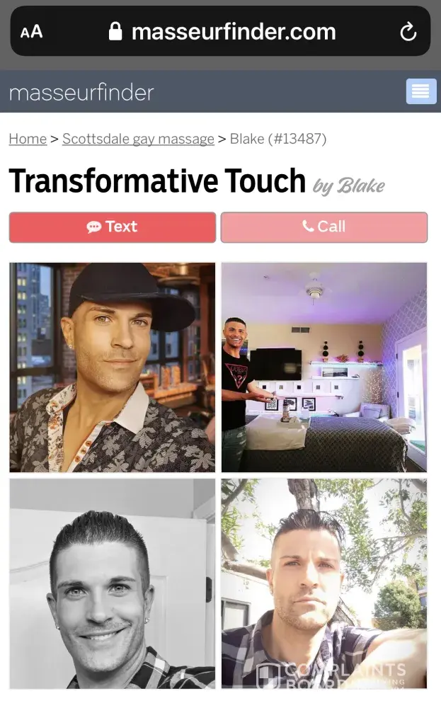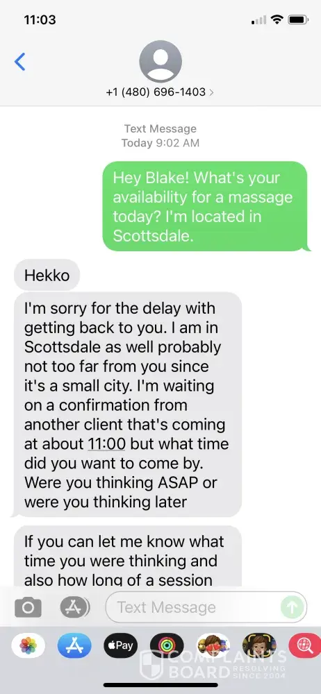 I reached out to "Blake" via the "text" Function on massuerfinder.com, staying in Scottsdale at a Luxury Resort, Blake's response initially was kind and willing to book a massage. Later, I received a text to confirm AGAIN, to guarantee I was not scamming him. Then he said his Car was in an accident, could I send him an Uber. I purchased a $25 Uber GC and send it to the email address he provide. I contacted the CC company and Uber to complain of this scam. Next is channel 3 news "on your side" - AFTER I CALLED him out on his scam and that I would reporting to him, he told me he would return my $25. Never happened! DON'T get scammed by this guy!