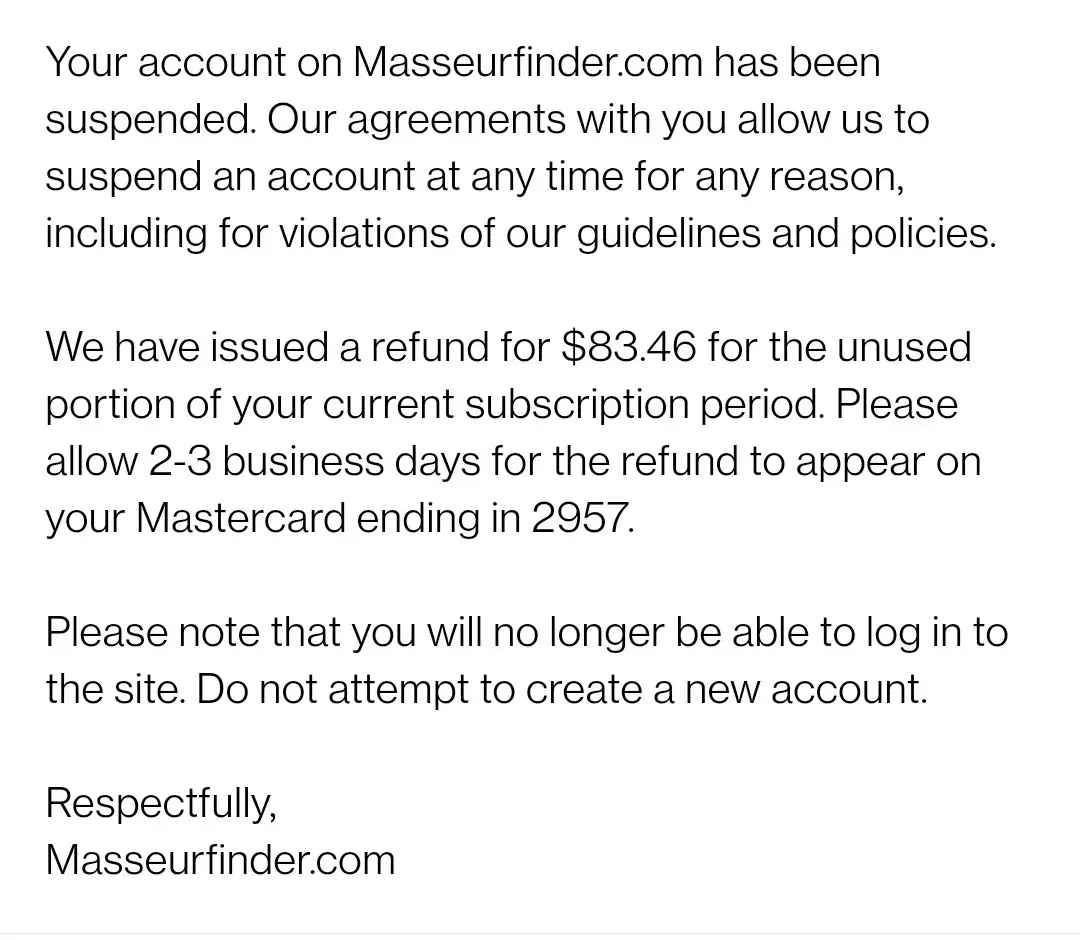 Your account on Masseurfinder.com has been suspended. Our agreements with you allow us to suspend an account at any time for any reason, including for violations of our guidelines and policies.