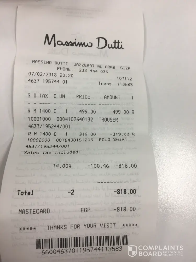 I got used to buy staff from Massimo Dutti, and two weeks ago almost i brought many items from your store, i wanted to exchange one of these items with another one more expensive with almost 50%, but unfortunately i lost the receipt, however the piece is with its price and label, they refused to make the exchange unless i had the receipt, my experience with other brand that receipt important in case i want my money back but in case of exchange this is not required, the piece is with 1.900, and i wanted to exchange it with a piece with 2, 900, the store manager was not supportive what so ever i think, this incident happened in CFC store EGYPT
