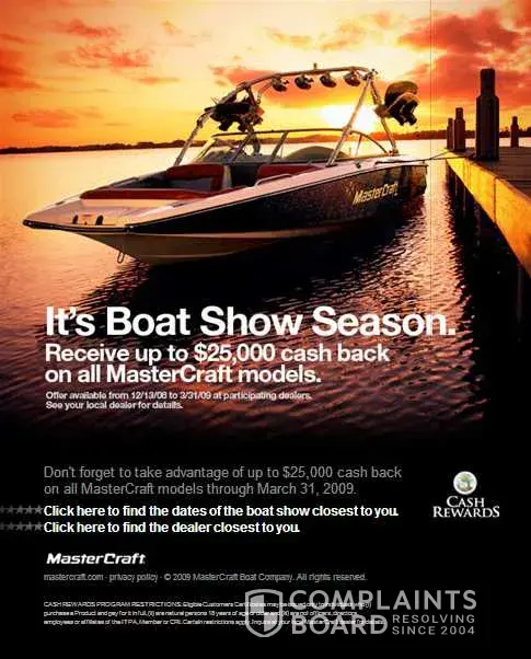 MC authorized, endorsed and encouraged their authorized dealers around the country to sell a Cash Rewards program whereby customers were encouraged to buy into the program (buy in varied from $1000 to $3000). After a 3 year period the customer was required to mail in required information and where they would then be issued a rebate. Rebates varied from $5, 000 to $25, 000. The Cash Rewards group ended up being a fraud and filed BK. MasterCraft ha chosen to ignore all of their loyal customers by putting all the blame on the CR folks even thought MasterCraft encouraged, authorized and fully endorsed this program.