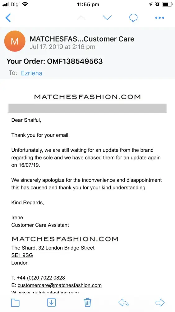 The response from Matchesfashion rather shocked me. They stated that the item repaired was shipped to me in a better condition than it was when I mailed it back. That was complete dishonesty. I requested a proof of their claim, after all, at that point they were basically calling me a lire. No proof of their claim was ever produced, because it simply doesn't exist. I suggested that MATCHESFASHION fashion credits my account with 50% US Dollar value of then total I paid for the item towards future purchases and for what they've put me through, but I have never heard back. I honestly do not understand why they've treated me with such complete disrespect. I have been a very loyal customer and have spent a lot of money with them to date.