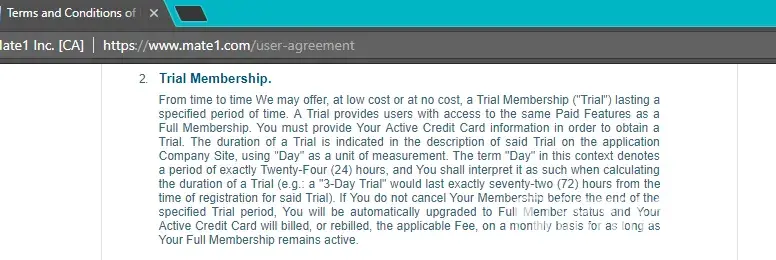 This is a scam! You can't even reach these people, or email them! If you manage to reach them they hang up! This is a scam so many people have complained about mate 1. I refuse to pay it, and iam disputing it with my credit card company! A trial is just that a trial! No one has the right to go into your account! Unless they get your consent, or ask you! They never consulted me after the trial to see if I was interested they kept just taking money out! Which is a scam! They get you to do a trial so they can get your credit card, and do things like this! Iam very very upset! I had to cancel my credit card so no more fraudulent activity can go on my card! Iam disputing this with my credit card company! I refuse to pay these charges as it is a scam, and fraudulent activity!