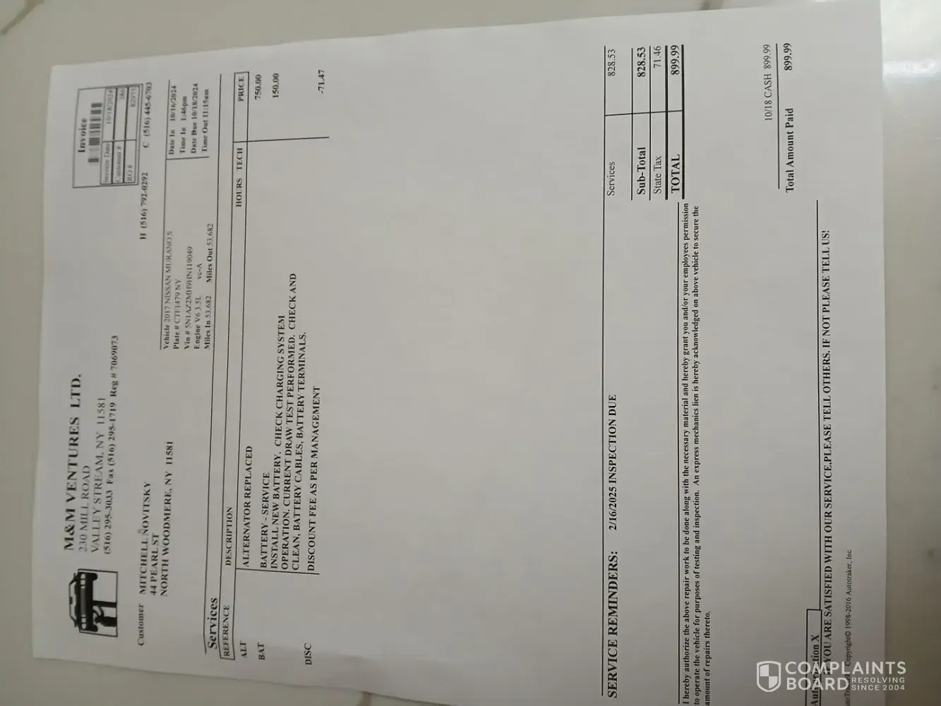 I bought a battery for my 2017 Nissan Morano at Mavis in Valley Stream NY, in July 2022. (License# NY — CTF1479). The battery malfunctioned and I replaced it at the same Mavis in May 2024. The replacement battery was unfortunately defective (as was likely the original one), and it caused my alternator to malfunction. While riding on the highway, the car...