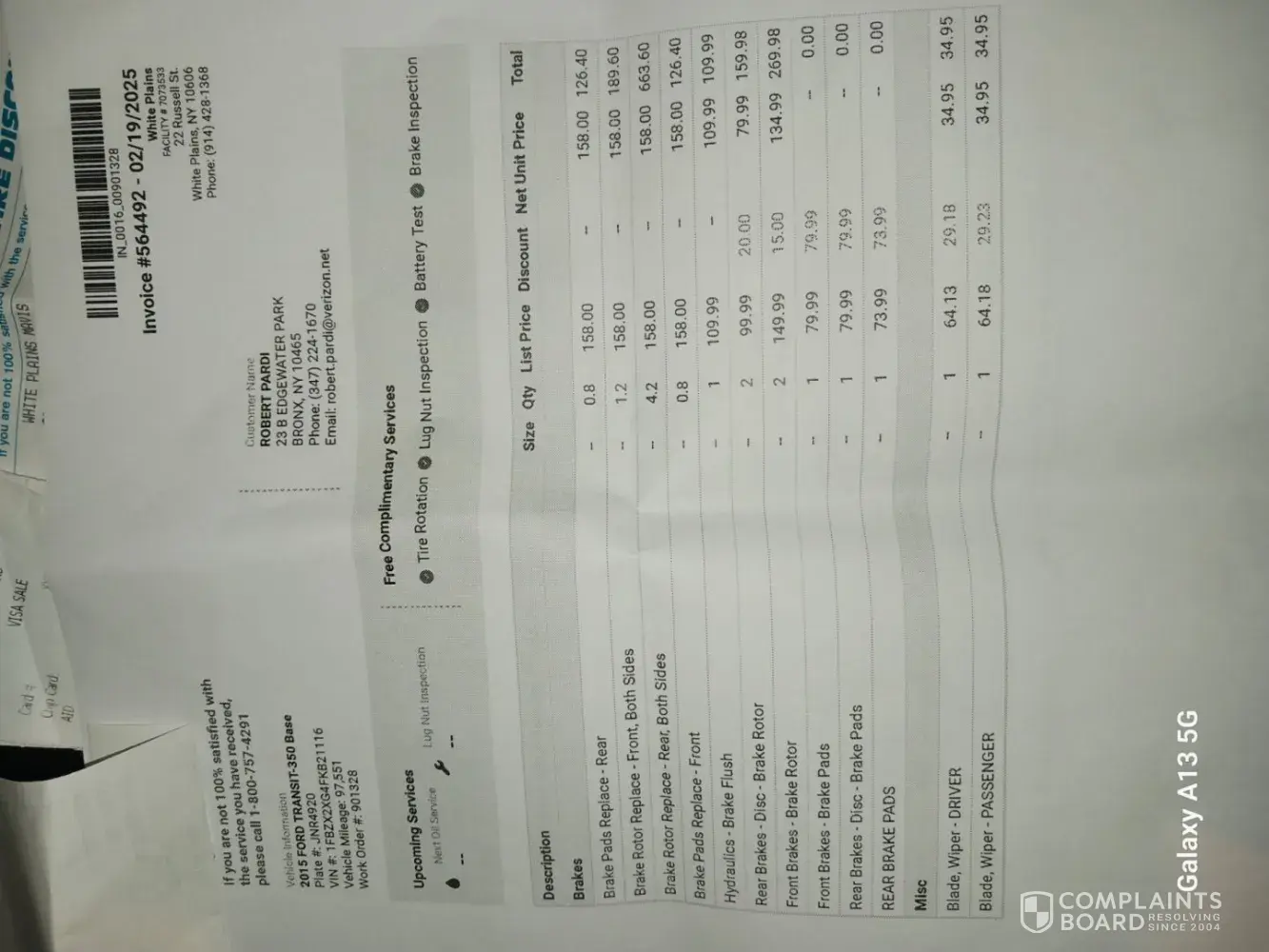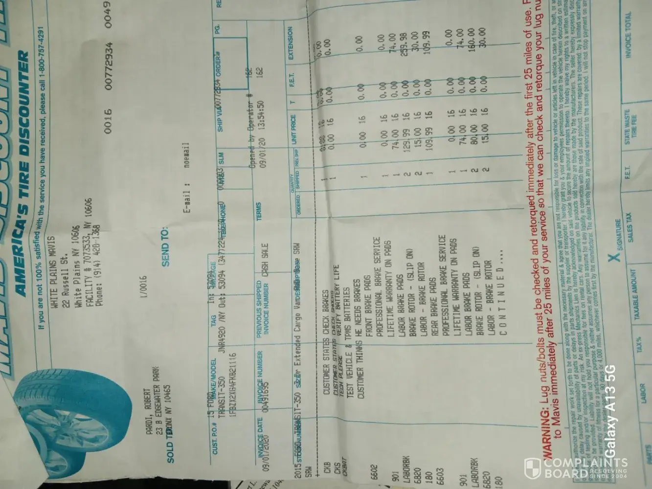 I brought my van to have the front & back brakes and rotors replaced at: Mavis Discount Tire - # 16 22 Russell St. White Plains NY, 10606 [protected] on February 19, 2025, I was charged $1859.55. When I had the same work done on Sept 1, 2020, I was only charged $741.26. I spoke with the manager Ricardo yesterday. And he claims due to inflation that's why I...