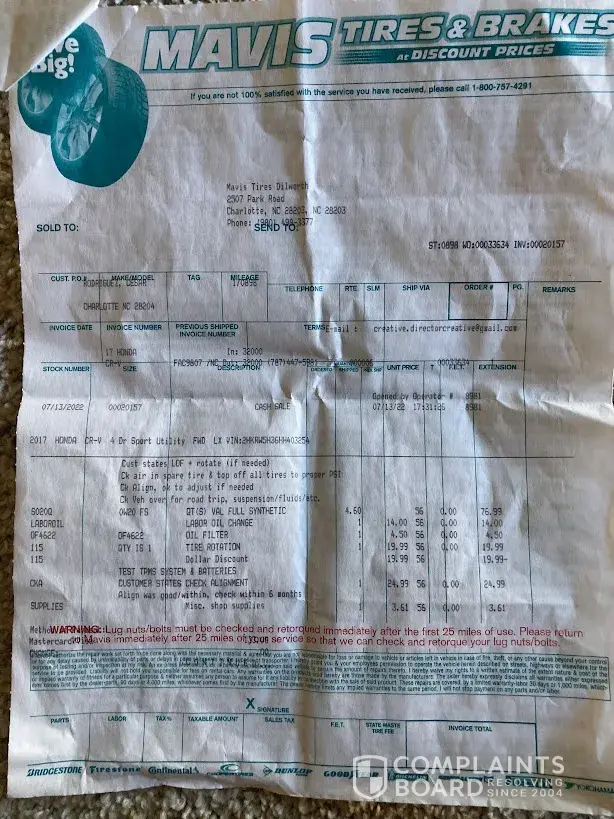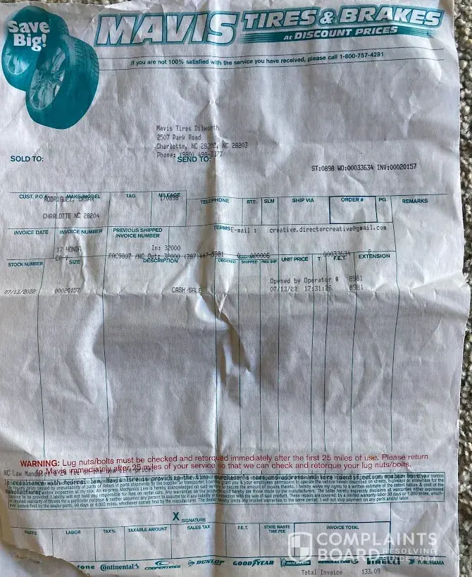 Desired outcome: nothing was done sent this to Mavis corporate complaint dept Oct ^would like a refund