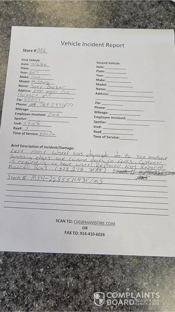 I bought 2017 mustang in for a tire I bought to be put on in Madison Ms on my front driver side on a brand new rim it took 3 hour's to put the tire on I showed the manager the damage on site he took pictures of the damaged rim and wrote a complaint up on the incident I also took pictures of the complaint and video of him checking the damaged rim and said he would have to send it off to corporate on 7/12/2022 it was filed as documentation