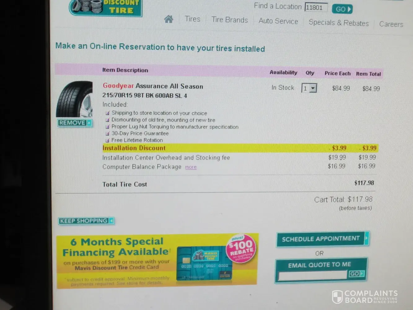 We seen a mavis ad which seemed pretty good so then looked online & found a mavis calculator which I thought would make thing easy & quick. We wanted to purchase 1 goodyear assurance comfortred touring tire.