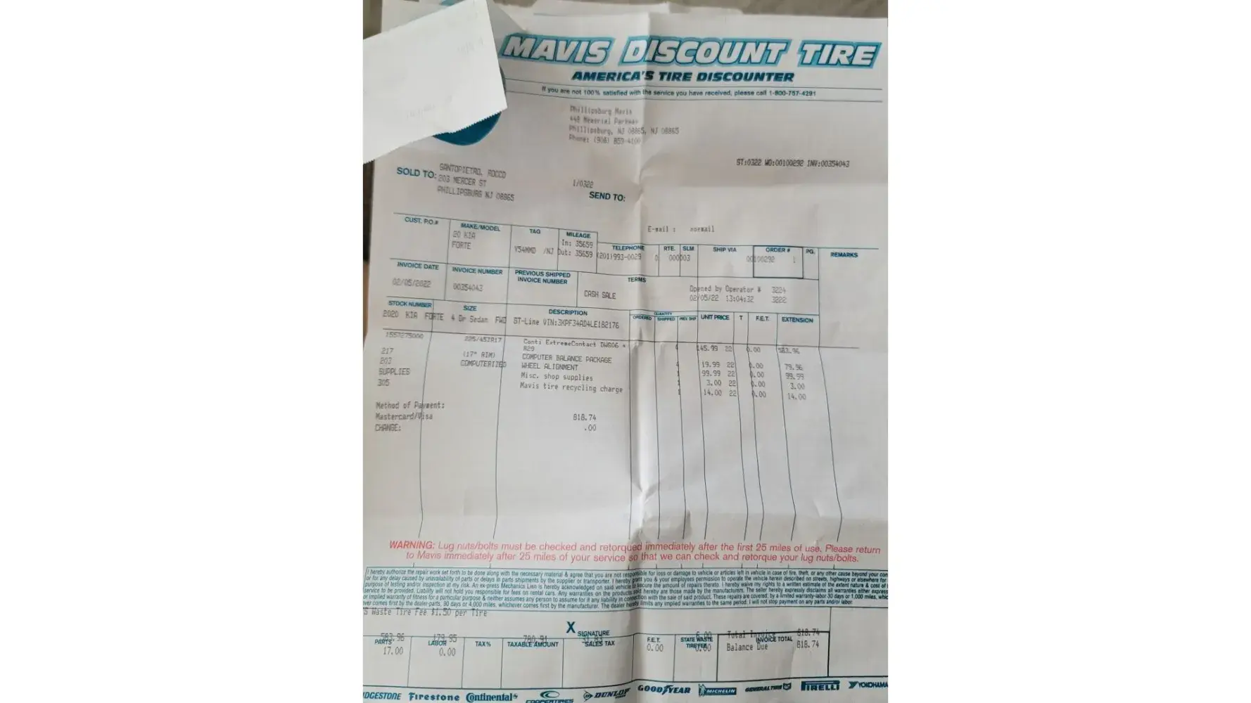 Brought the car back to your Mavis dealership located on Memorial Parkway in Phillipsburg, NJ and spoke to the assistant manager and training Manager and they stated that they cant do anything for me that i would have to call Continental Tire Corporate office and in the mean time have to purchase new tires.