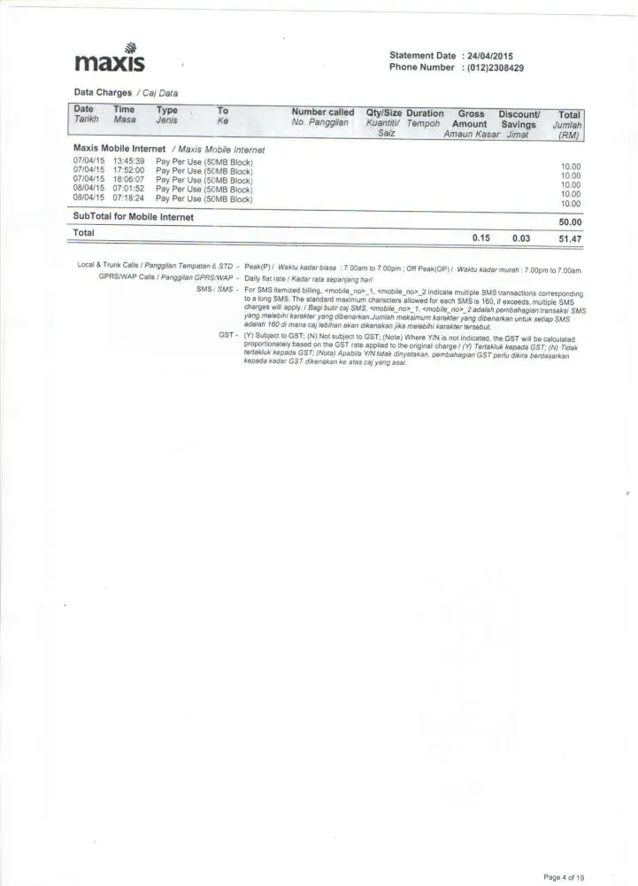 I was charged rm 50 from Maxis which i didnt subscribe the data but shown i had used.