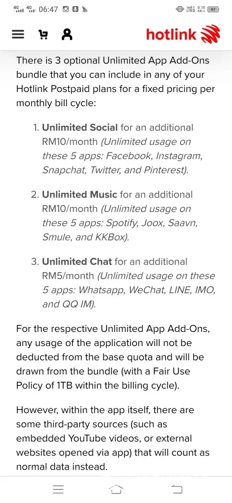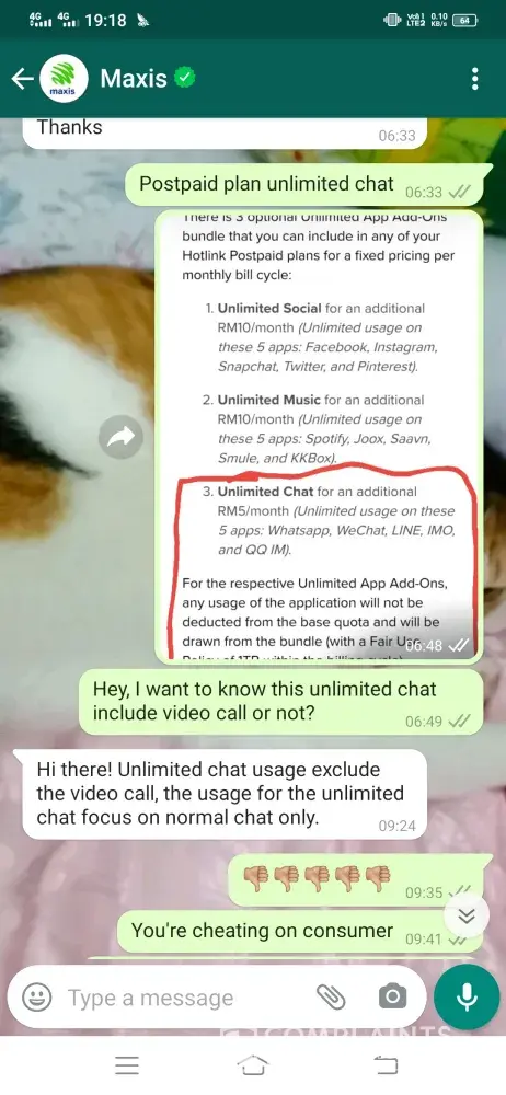 Maxis hotlink unlimited chat, in the description you only wrote if third party app is open, then additional data charge will be apply, however the video call and voice call which is still within the app itself not counted as unlimited chat! During this pandemic, we all are far away from family, video chat means so much to us, but the service you provided was misleading us!