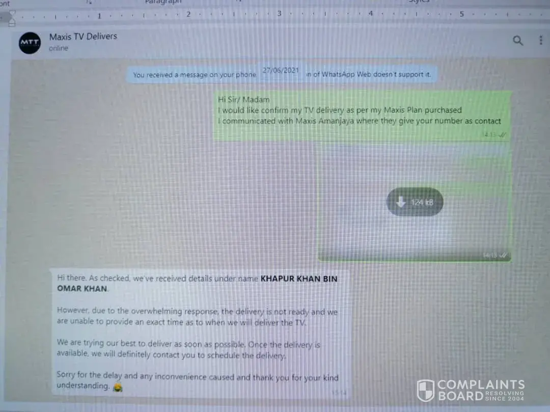 Due to it, I contacted Amanjaya Mall Sungai Petani where the mentioned due to overwhelming response, the delivery is not ready and they are unable to provide an exact time as to when they will deliver the TV. On top of it they provide to contact number of the person who will deliver the TV. Same response given when contacted the person thru WhatsApp.