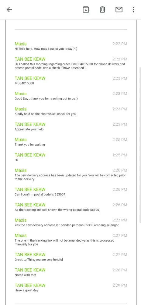 I booked online on 22nd Sept 2020 tend to recontract Samsung Galaxy note 20 Ultra (Mystic White) for 012-8038640 under zerolution with share 48 plan, after booking was made and confirmed, I called in to the hotline as I input a wrong postal code, the first agent suggest to cancel and rebook and it can be instant, I waited for estimated 40 minutes, called in again as it is still not possible to rebook, second agent told me that the order is not cancel, can assist me to change the postal code, so I was happy, I called in again on 23th September 2020 morning 9am to check on the status, a guy told me no issue and can amend the postal code, as delivery is scheduled for 24th September 2020, I proceed with the live chat service in the afternoon and agent assured me that the postal code has been changed successfully and it won't reflect in the order tracking site as it is manually change. To my surprised, one guy from maxis called me on the scheduled date 24 sept 2020 morning told me it is cancel and have to rebook, I proceed to rebook and my number 012-8038640 is greyed out as attached, in the after I chat with agent again if I can walk in to maxis centre klcc to self collect the phone instead, and I was told that it can be done, I went there after work and traffic, and wasted about 30 minutes talking to the staff and still fail to get a phone, while above are all agent solution, it has truly caused me inconvenience and I was given a case number C24681258, I sincerely hope such simple issue can be resolved quickly and I believe I have been much patience thus far