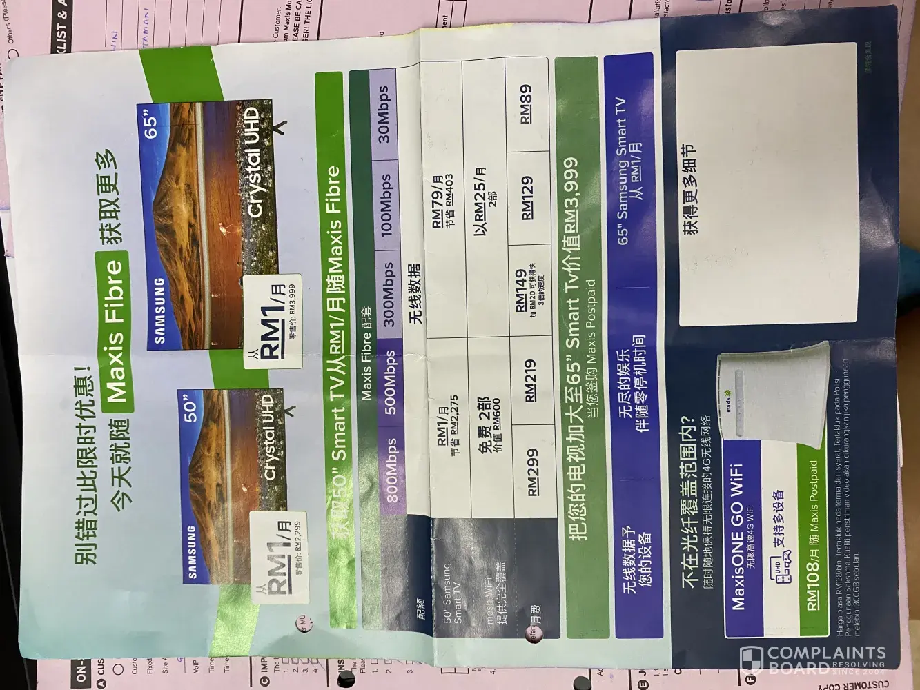 Last December (2020) I signed up for the home fibre package due to the 50" Samsung TV which cost RM1/month promo at Maxis MEP Tesco Penang. I was explained that the 24 months package which cost RM219.00 per month would entitled for the 50" Samsung TV. I signed up for the 500Mbps package and was told that the installer will help me to apply for the TV. So, i went on and cancel my Unifi, switched to Maxis as told. Router installation, Mesh installation done within 2 weeks and every time i asked about the TV, i was told Maxis will contact me. End of Dec, i called Maxis Customer care [protected]) and i was assured that my TV coming directly from Samsung warehouse by 15-Feb-21 and they will SMS me directly for the delivery. After waited and nobody call, i called Maxis Customer care today, guess what...……...i was told i did not fill any enquiry for TV ! Maxis Customer care told me nothing can be done, i need to go back to the MEP! i am totally piss off with Maxis, such a reputable brand, such a bad process and mishandling, putting customer at dark, pushing us here and there...……. i don't know what went wrong in this whole process but this is totally not fare, Maxis put up such a big advertisement and now what? i want my TV !