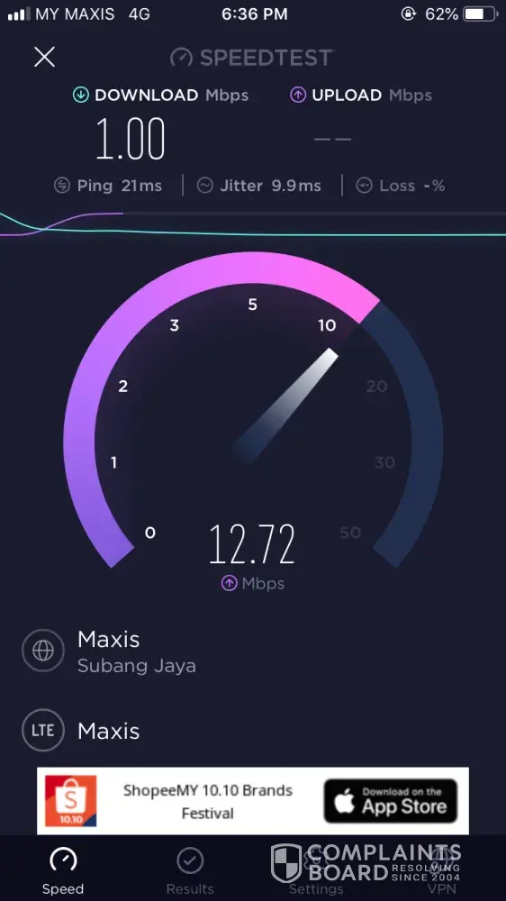 I have been experiencing very bad service with the stability of my internet connection on my phone. I have done multiple speed test during these occurrences and the results have not been poor. Please note that all of this cases have happened within the Klang Valley and I have started to make records of it since the 24th of October 2019. Photos of the speed test results are available for your review and action. As a customer of Maxis and Hotlink for almost 10 years I am gravely disappointed at the service provided. Your prompt action on this matter is much appreciated.