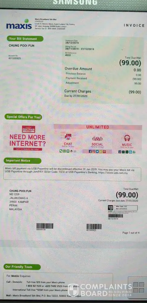 end of October i saw in my Maxis app why i still have overdue Rm307.65 but i never received email or bill. so i go check with Maxis center at the spring on 4th November. i try to ask why i never received anything bill about this and i thought this is prepaid why charges me so much. they ask me to go back to dealer to double check.