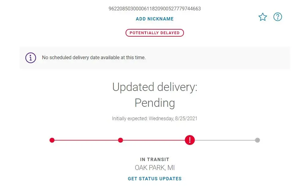 I have been expecting a delivery since 8/25/2021 and I keep getting "potentially delayed" messages every day. The tracking number is 9622085030000611820900527779744663. According to FedEx tracking, my shipment has been sitting in Oak Park, Michigan all week. I do not understand what the hold-up is with my delivery and I would like to know what is going on. Please let me know why this is happening. I paid extra for expedited delivery and I am still waiting. The Maytag order number is [protected]-627058. Pls contact me via email at [protected]@yahoo.com. Thank you very much.