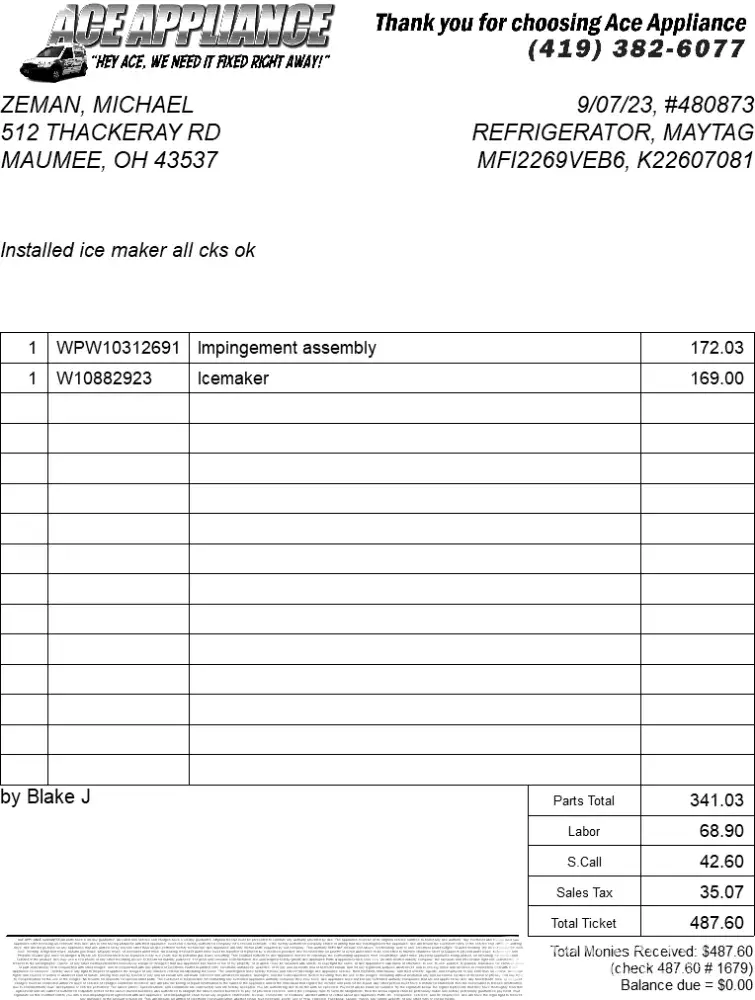 Purchased the above Maytag refrigerator Model #FMI2269VEB6 on 8/17/2012 with a serial #K22607081. Also purchased an extended warranty. The ice maker has been replaced 3 additional times from the original unit and the most recent invoice is attached for $487.60. This a 2 adult household. Additional service records are available upon request. I'm attaching the service that has been recently provided. Door seals were previously replaced and they are already failing. I've always thought the Maytag brand appliances were very good quality and provided years of dependability but I've definitely learned otherwise at least for this unit. Marla Wholf & Michael Zeman