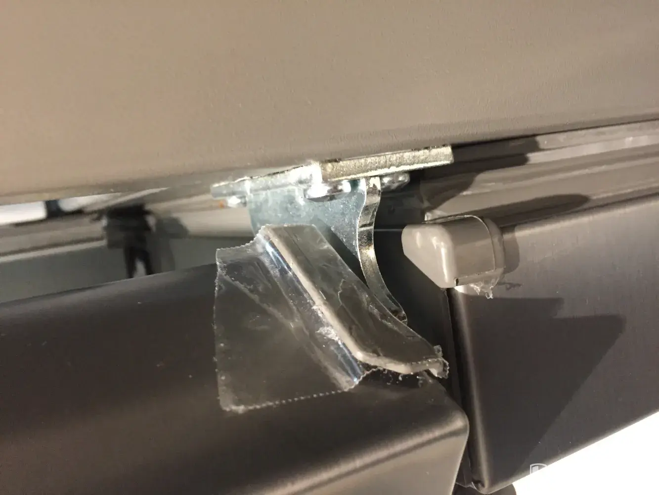 Small plastic part on bottom of right door is broken (see enclosed photo)
