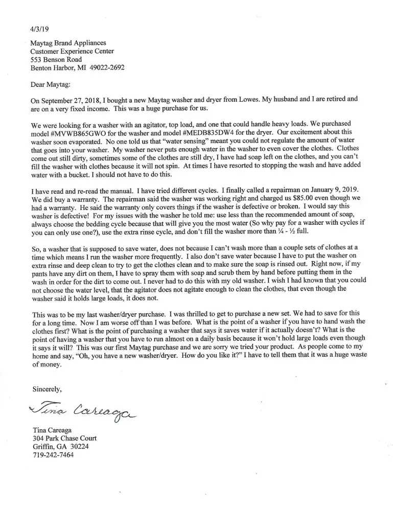 On September 27, 2018, I purchased a Maytag washer, model #MVWB85GWO. This washer was supposed to save you money on water by "sensing" how much water you need. It was also supposed to be a large capacity washer. We have had clothes come out still partially dry, and with soap still on them. When you look through the glass lid of the washer you can see the clothes agitating with no visible water. I read the owners manual several times, tried different cycles, and could not get better results. I called a repair man on January 9, 2019 and he charged me $85.00 to tell me the washer works as it was designed to (you are charged even if you have a warranty if they determine the washer is not broken). He told me that you could not fill the washer more than a 1/4 full with clothes, you could not use the amount of soap recommended for a load, you always needed to use the bedding cycle (this is the cycle that will give you the most water), and use the extra rinse cycle. So, you do not save money on water because you wash almost daily and have to use the extra rinse cycle. Your clothes don't come clean if you do not pre-scrub any stains or dirt before washing because there is not enough water. You also have an increase in your gas or electric bill because you are washing more frequently and for longer periods of time (adding the extra rinse cycle). I have paid for a washer with several cycles and can only use one. I have paid for a large capacity washer and you can't use 3/4's of the space. The manual for the washer does not tell you that you can only fill the washer 1/4 full, that you can't use recommended soap amounts, that your clothing must be pre-washed, that you should only use the bedding cycle, or any of this. I feel Maytag has deceived the public by making us think we are buying a large capacity washer that saves water, when you are not. I wrote a letter to the Maytag Customer Experience Center in Benton Harbor, MI. They did not respond. I called customer support and was transferred 3 times (having to go through the story each time) with no one willing to help in this situation. They told me to contact the Customer Experience Center, which I had already done. I did receive a letter from the Maytag Service Plan Team offering me the opportunity to by additional service coverage! I bought a 3 year service plan when I bought the washer. Why would I need more! This washer is not what it was advertised to be, and I feel Maytag should exchange it for a different washer.