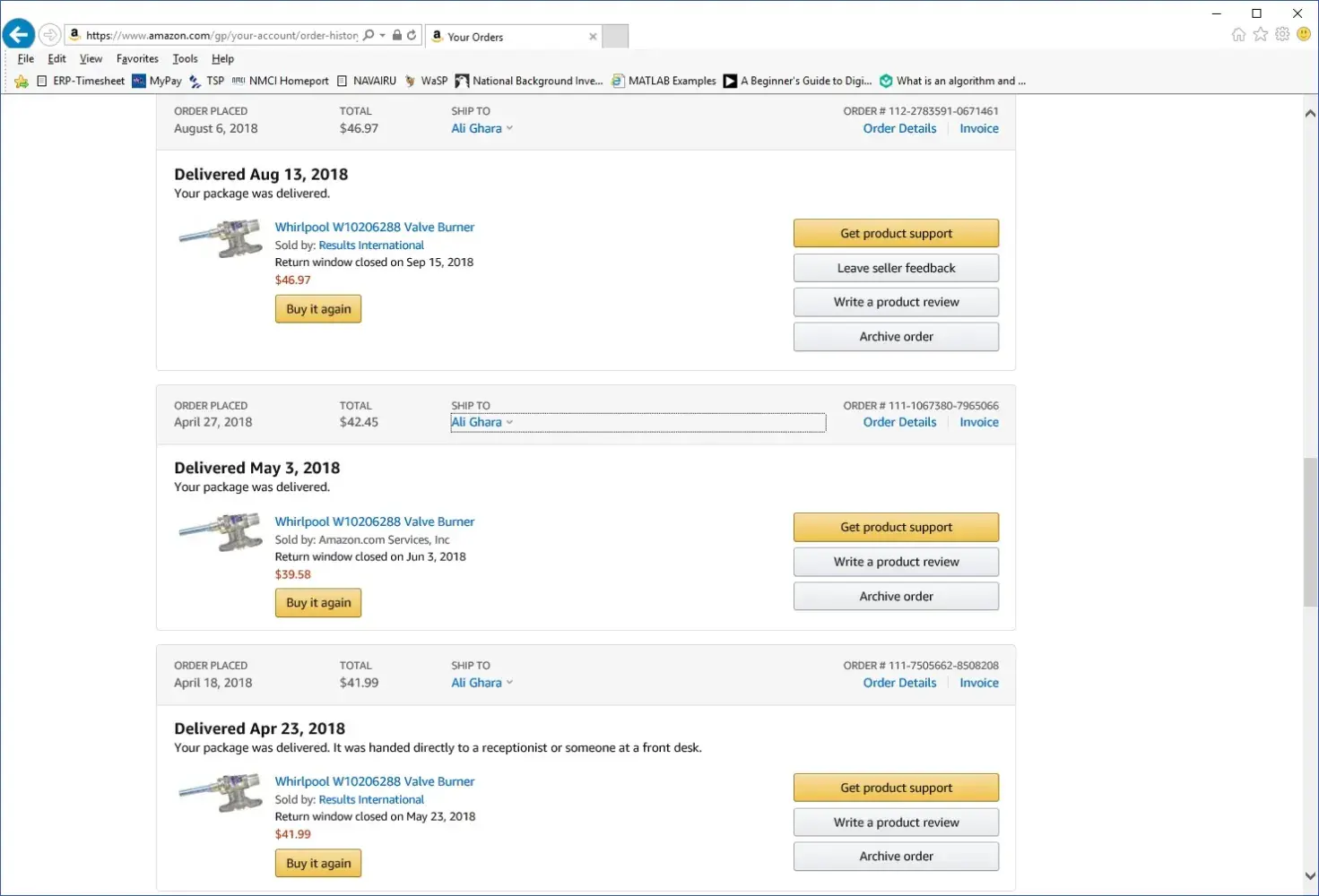 Attached please find the receipts for the last 3 valve-burners (part#W10206288) that I have purchased from Amazon since April 23th, 2018.