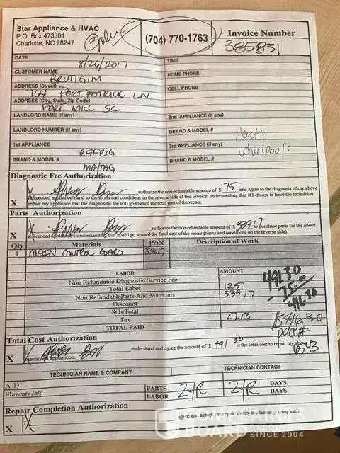 On 8/25/2017 the control panel of the unit did not show any display. Lights and temperature monitoring did not work. The unit interior temperature started to increase as evidenced by condensation in both the refrigerator and freezer compartments. The master control board had failed on the unit as identified by a service technician on 8/26/2017. This complaint involves three aspects - the service broker Fort Mill Appliance Repair 414 Tom Hall St, Fort Mill, SC 29715 phone [protected]; the service provider, Star Appliance & HVAC, PO Box 473301 Charlotte NC 28247 phone [protected]; and Maytag the parts provider. Note that the component failure was identified 8/26/17 - the repair was completed on 9/7/2017. In short $455 was spent on dry ice during the "emergency repair process" - an average of $35 per day for 13 days. The repair cost $491.30. Thus the total repair bill was 946.30 for a part that cost $339.17. We were lead to believe that the part was readily available and that the repair should take several days. Had this been the case we would not be writing. The high level of frustration came from the lack of response from the service broker and the service provider as calls and text messages sent went unanswered. When we did get a return call the issue was the part " is on back order". Now what I find tough to believe based on my 30+ years of experience in global manufacturing and logistics that a part was not available that could not be shipped in the entire Eastern US supply chain or US supply chain. What we are asking at this point is at a minimum a refund on the part of $339.17 or preferably a full refund of the repair of $491.30 based on what was spent on dry ice due to the expectation that the repair was a several day event.