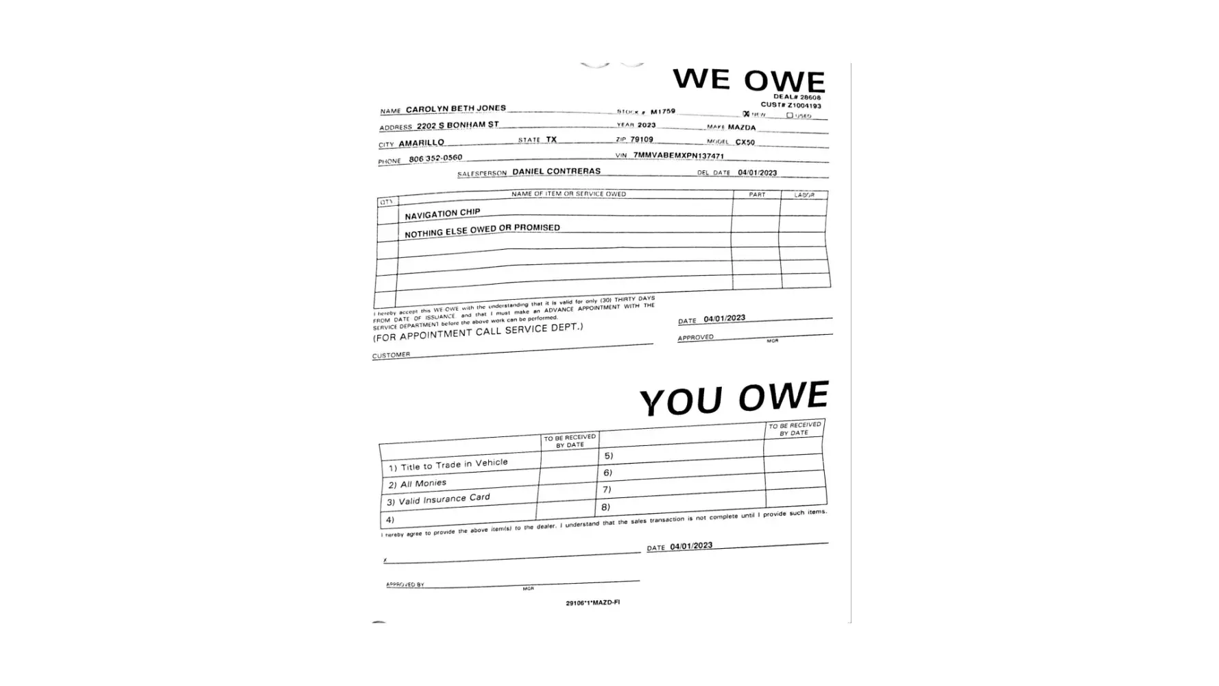 I purchased a CX50 April 1 of this year. Part of the contract was a navigation chip was to be included. Please find attached copy of that page of the contract. Amarillo Mazda refuses to honor the contract