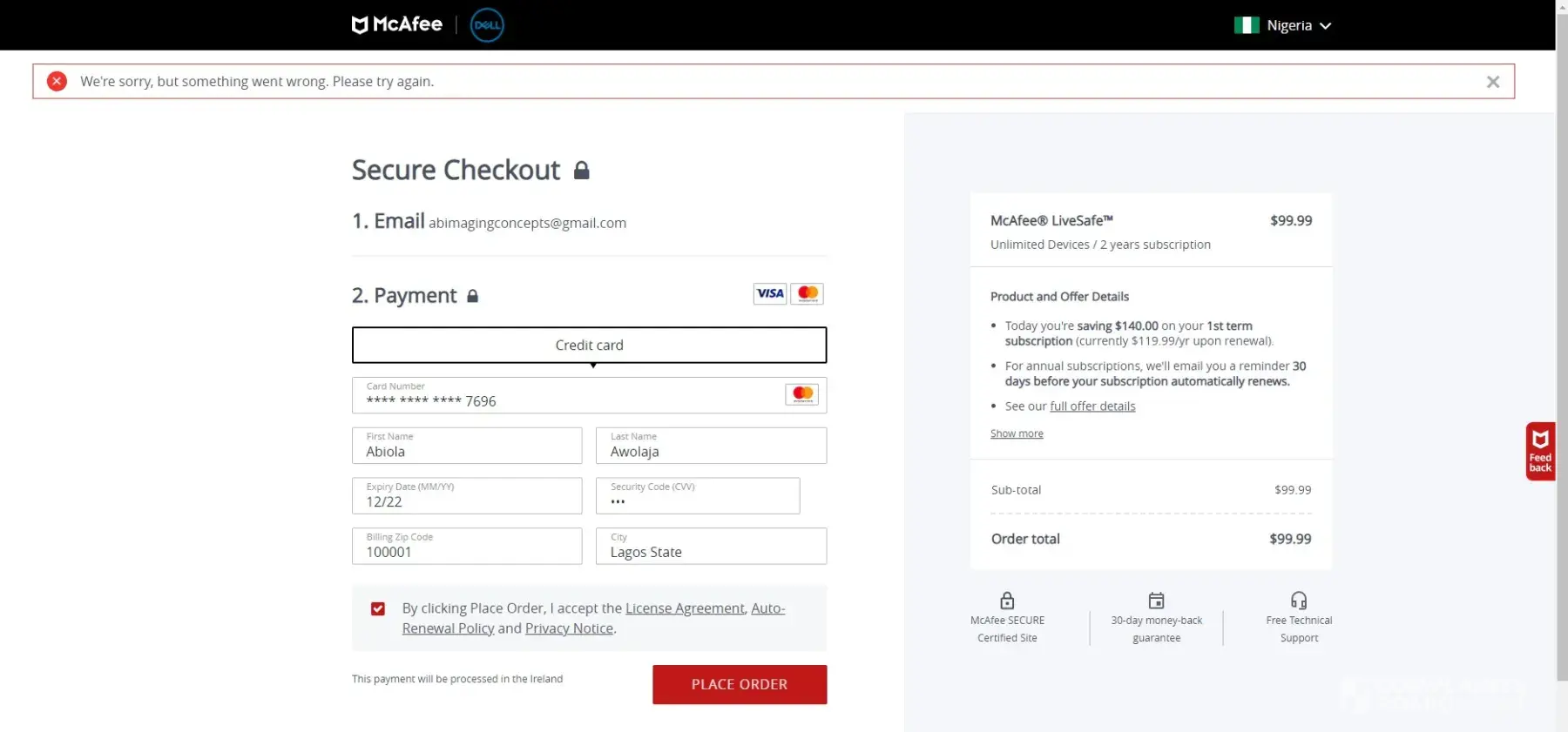 I've been trying to renew my subscription multiple times but I keep getting this error message, "We're sorry, but something went wrong. Please try again".