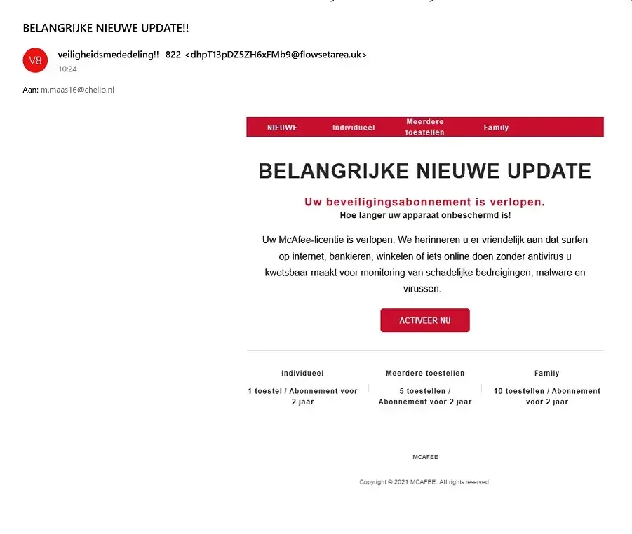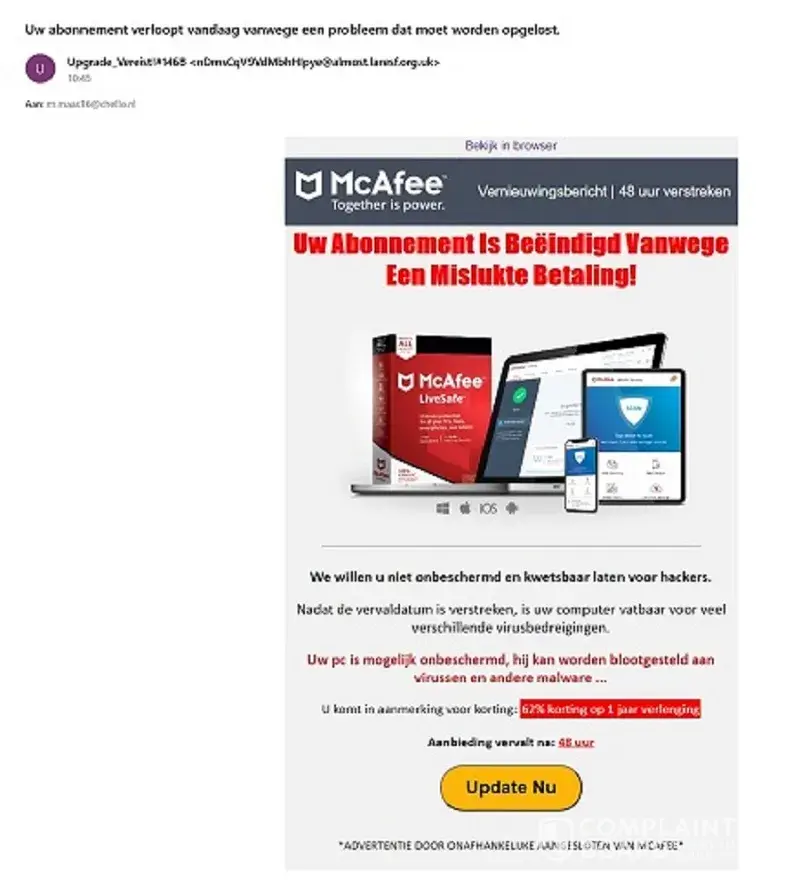 I do not have a subscription to a MCAFEE product and consider this type of email to be very unethical if not criminal.