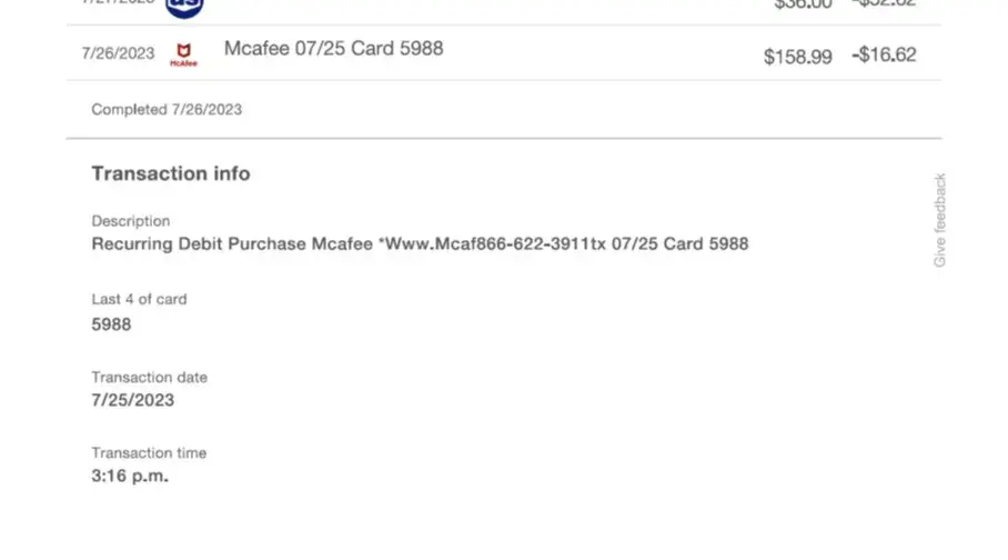 I purchased an antivirus program for my computer for $133.25 on 7/22/23. I received my credit card statement on 9/923. Checking through my cc statement, I noticed the $133.26 charge that cleared on 7/24/24 PLUS another charge for $58.63 on 8/7/23 which cleared on 8/8/23. I called McAfee customer service and explained the situation and do you know what they told me?! That the charge is over 30 days and cannot be refunded. I explained to them over and over again including the supervisor that I DID NOT PURCHASE THIS PLAN FOR $58.26, I already paid for the $133.25 plan. How can I check the purchase within 30 days when the cc statement comes in after 30 days and I am not aware of this purchase. THESE PEOPLE WERE NOT SYMPATHETIC; "IT'S THE RULES" they told me. I told them to have their manager call me. I will also call my bank to see if they can help and will let everyone know that McAfee IS THE WORST! DO NOT PURCHASE MCAFEE! If it is so easy to charge a service to your account, then there is something seriously wrong with the system for ordering.