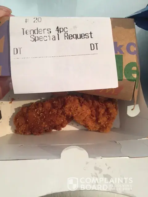 i ordered a 4 piece chicken tender meal. vvhen i got home and started to eat them, they vvere tough and grissly. to late to go back to store, and not the stores fault. someone sent them some bad chicken. the store is mcdonalds on highvvay 31 Indianapolis, Indiana, I have had this meal there before and there vvas not a problem, so i thought i vvould try them again, I am sure disappointed