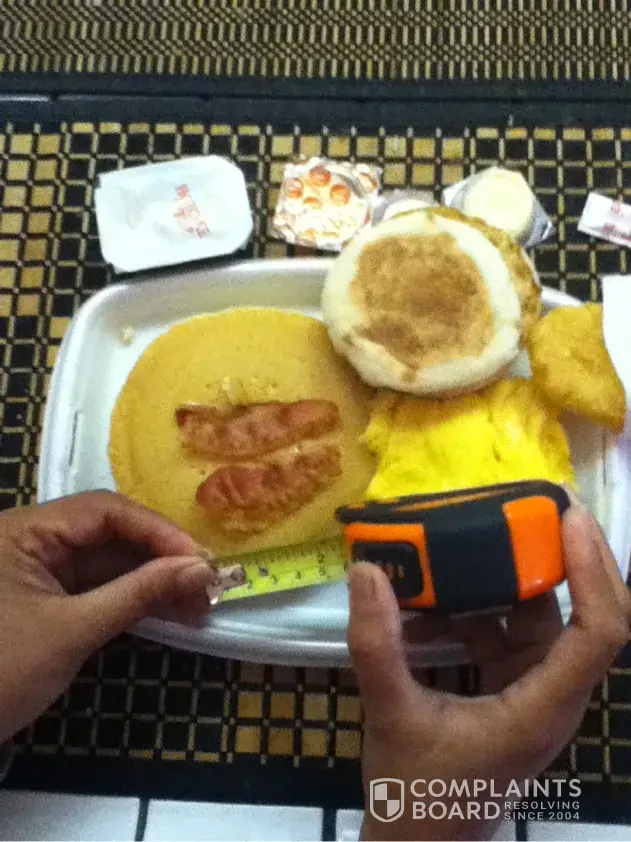 Two weeks ago my husband and I went to Mc Donalds in Mira Mesa to eat breakfast. Both of us ordered same thing - Breakfast Platter. I decided to take mine home but my husband ate his in McDonalds. When he removed the cover from the plate and was about to eat I was surprised to see two (2) little bacons, about 2 inches which used to be like 4-5 inche...